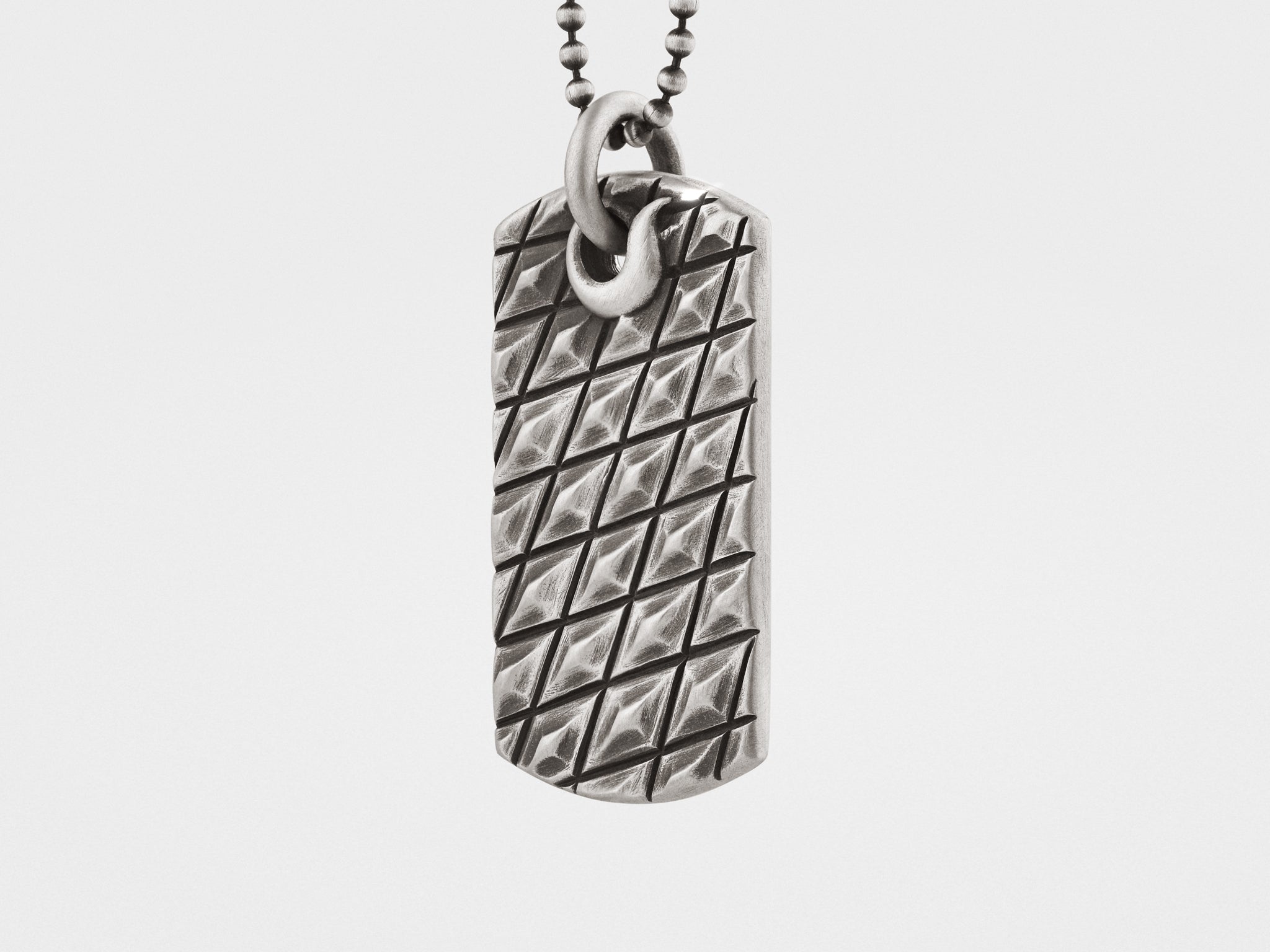 Inspirado en las propiedades protectoras de las escamas de caimán y las armaduras medievales, este collar con placa de identificación está hecho a mano en plata de ley maciza. Cada pieza tiene un acabado de pátina único y una sensación de lujo y peso agradable.