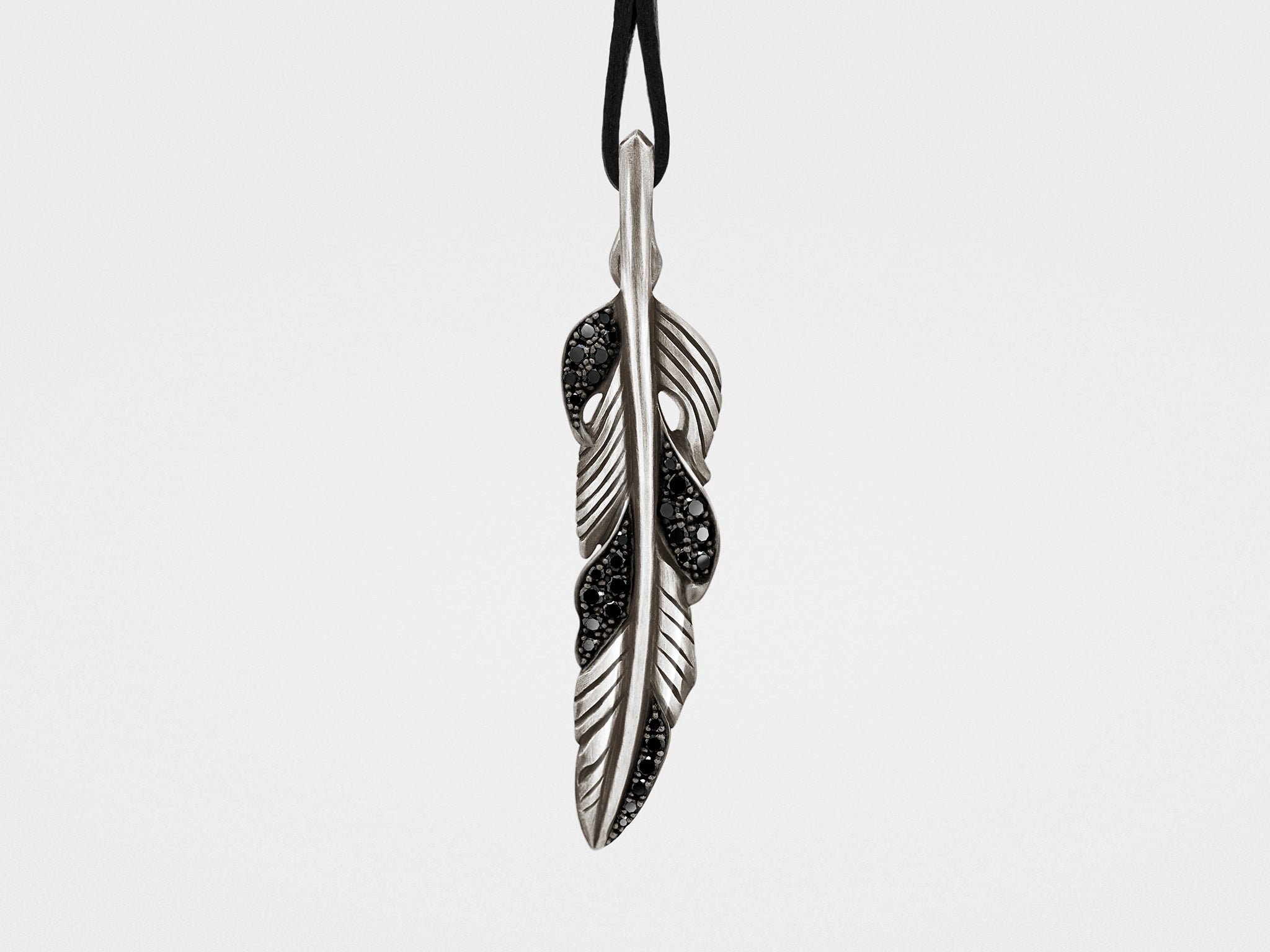 Este colgante de plumas bellamente tallado parece como si hubiera salido directamente de una pintura de Rubens. Tiene un acabado en plata esterlina oxidada para un aspecto antiguo y artesanal, y cuenta con 30 diamantes negros.