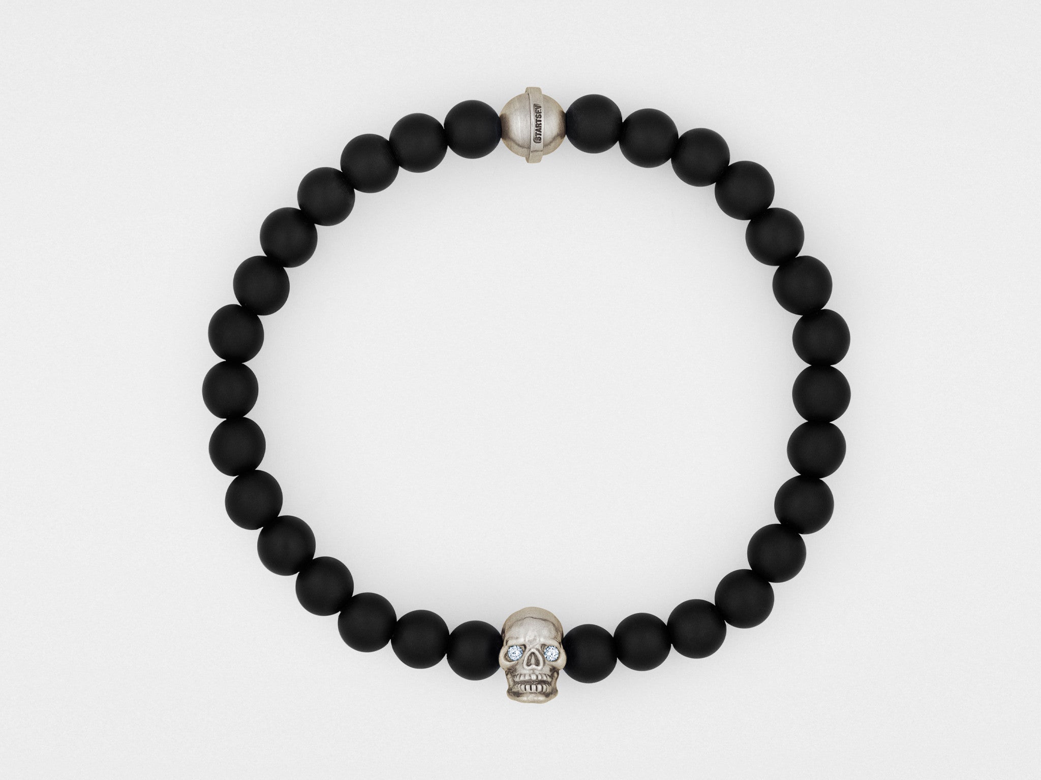 Elaborada a mano en plata de ley oxidada, la calavera está engastada con dos hermosos ojos de diamante, lo que le da un toque de sofisticación al diseño clásico de la pulsera. Esta lujosa versión de la favorita de todos presenta una tira de cuentas de ónix negro con acabado mate. Cada pieza es elaborada por un maestro artesano en nuestro estudio de Nueva York y ensamblada con un cordón elástico.
