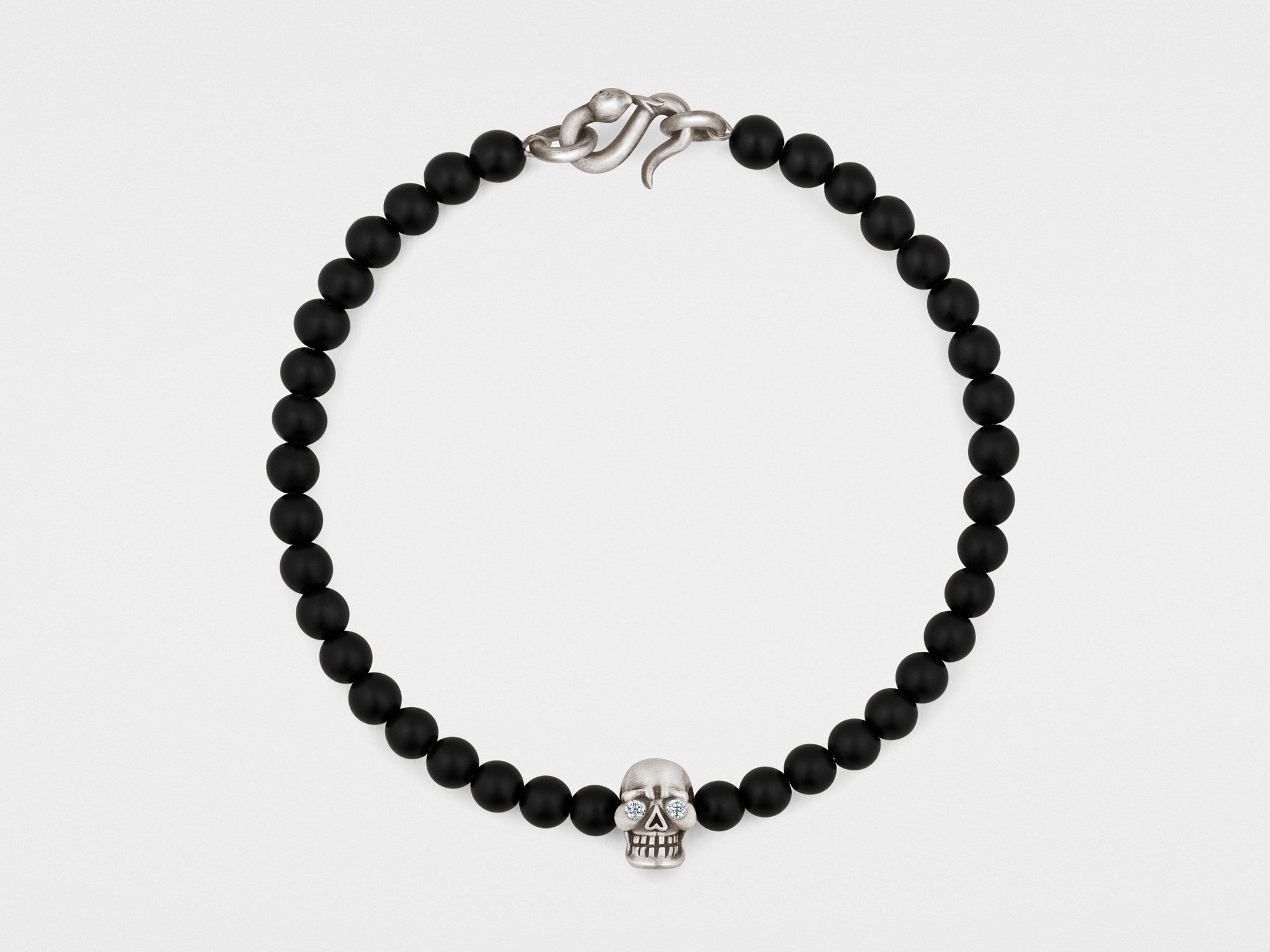 - La calavera es de plata de ley maciza engastada con diamantes de color HI de talla ideal y claridad SI1 en engaste bruñido. Peso total del diamante: 0,035 ct. Dimensiones: la calavera mide aproximadamente 6,6 x 8,7 mm. Cuentas de ónix negro de 4 mm con acabado mate. Disponible en tamaños: Extra pequeño, Grande. Hecho a mano en los EE. UU.