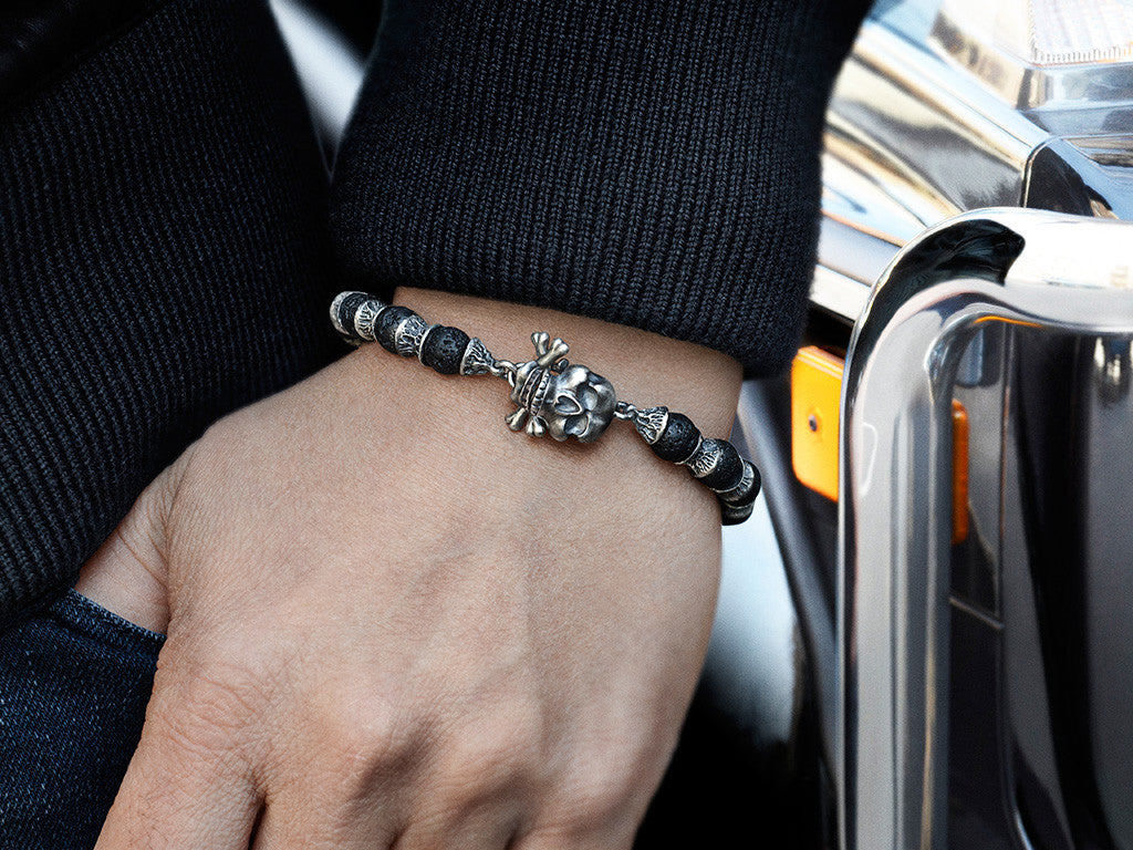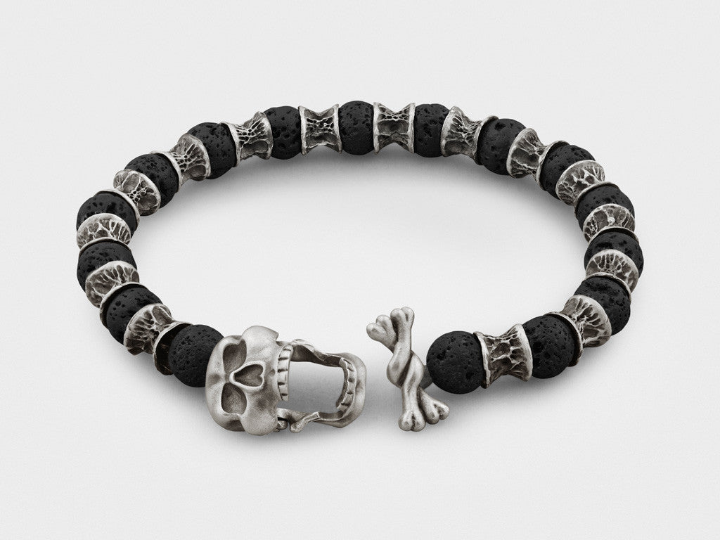 Pulsera de plata con cuentas de lava, calavera y huesos